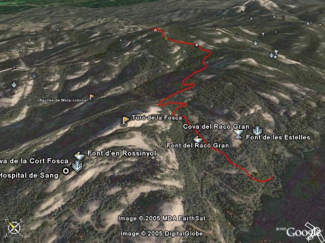 Grà cies a Google Earth, una remarcable aplicació gratuïta, podem sobrevolar el recorregut de la pista projectada, per veure "sobre el terreny" l'impacte de la mateixa. Si no la teniu ja instal·lada, us haureu de descarregar la versió gratuïta de Google Earth, aquÃ. Un cop instal·lada, podreu llegir el fitxer Projecte pista Mata-rodona.kmz, descarregant-lo al disc dur per a posterior ús o obrint-lo directament. L'aspecte del que veureu serà una cosa aixÃ, depenent de com tingueu configurat el programa: