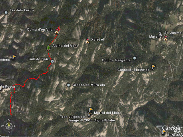 De sud a nord, el traçat deixa la pista de Mata-rodona per enfilar-se per la capçalera del torrent del Figueret, al Racó Gran. El tram inicial és marcat actualment (gener 2006) per estaques baixes, com es veu a les fotos 1 i 2. Va pujant fins arribar al Coll de la Cort Fosca, foto 5. A l'esquerra d'aquest tram queda la Carena de la Fosca. Des del Coll de la Cort Fosca puja fins Coll de Boix (foto 10) seguint Podeu clicar els indrets assenyalats a la imatge per veure una foto de l'estat actual dels mateixos (gener 2006). |